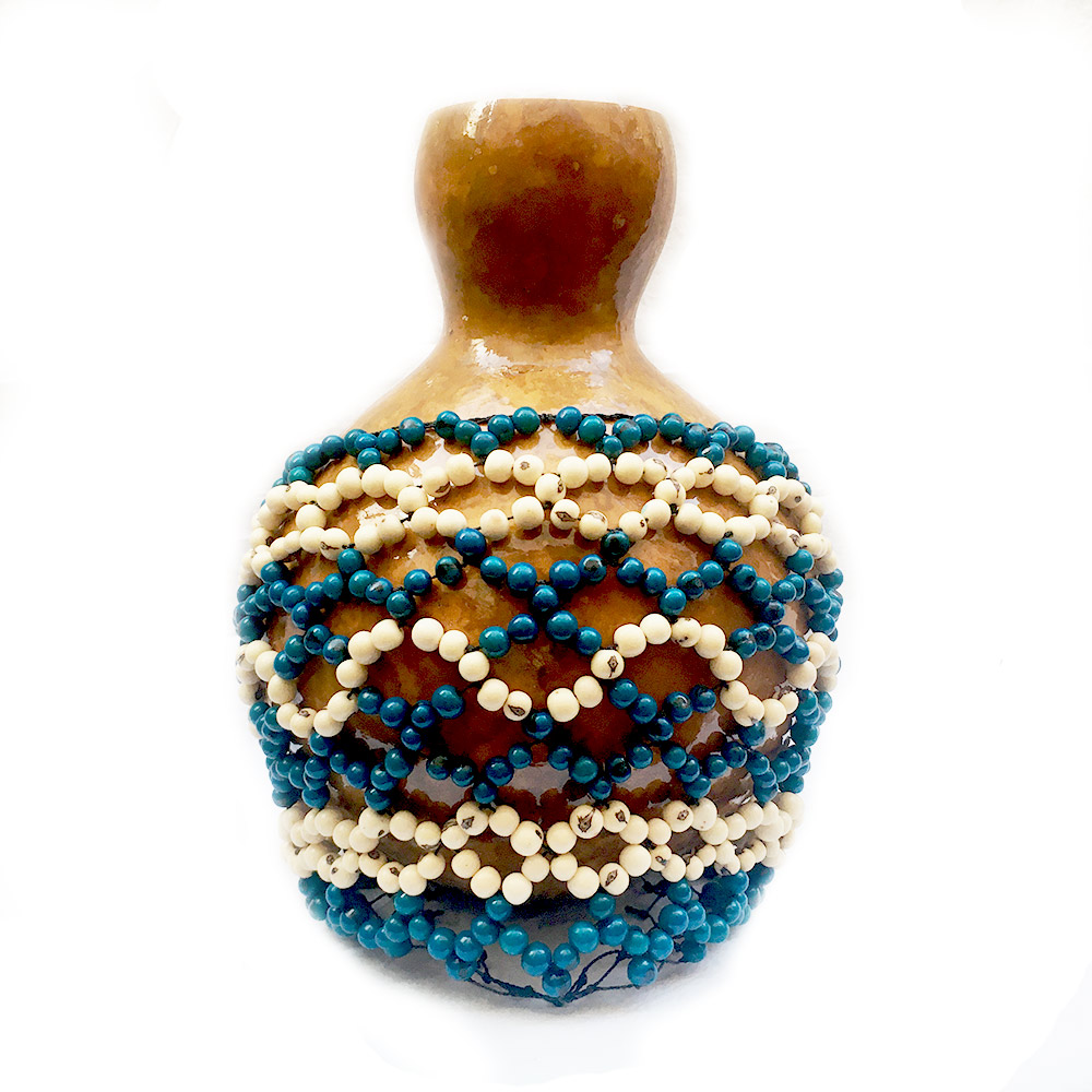 Shekere hecha con calabaza natural con semillas de asaí blancas y azules. El hilo de es de alta resistencia y en la calabaza aplicamos una capa de resina al interior para darle más resistencia.